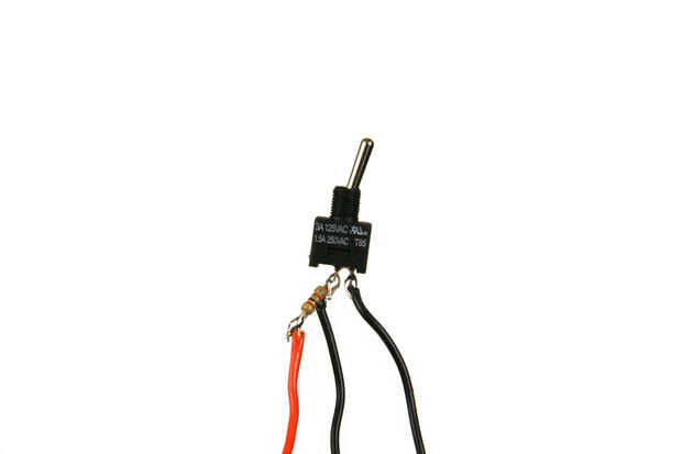 Este interruptor permite reproducción inversa de muestras grabadas.  Solde un resistor de 10kOhm a uno de los cables del interruptor.  Un cable rojo al otro extremo de la resistencia de la soldadura y conecte a tierra.  Soldar un cable a la ensambladura entre la resistencia y el interruptor y conecte al pin digital de Arduino 9.  soldar un cable negro con el conector restante del interruptor y conecte a tierra.
