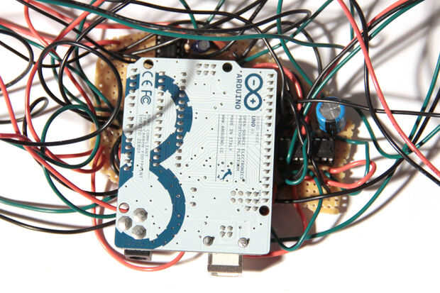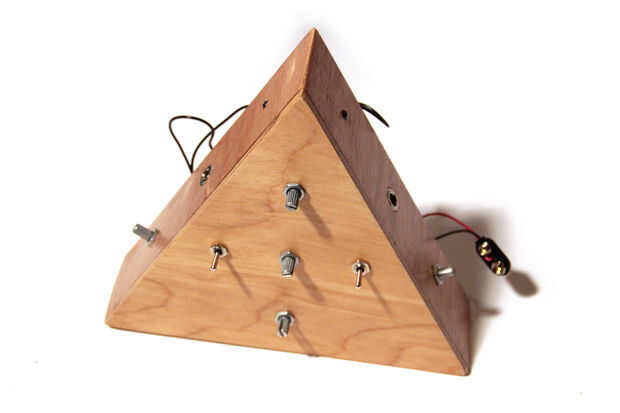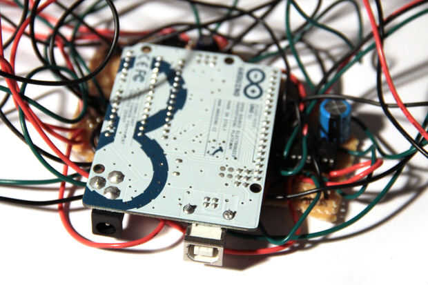 Conectar el Arduino con los pernos de la rúbrica de la protoboard y comenzar a instalar los componentes en el recinto. Empecé por colocar las macetas y cambia a la parte delantera del panel y agrega la tomas, indicadores LED y macetas a los lados. Finalmente, empujé puerto del usb de la arduino a través del orificio cuadrado en la parte inferior de la caja. Mi arduino sentado firmemente en su lugar, usted podría atornillar el panel trasero para un ajuste más seguro.
