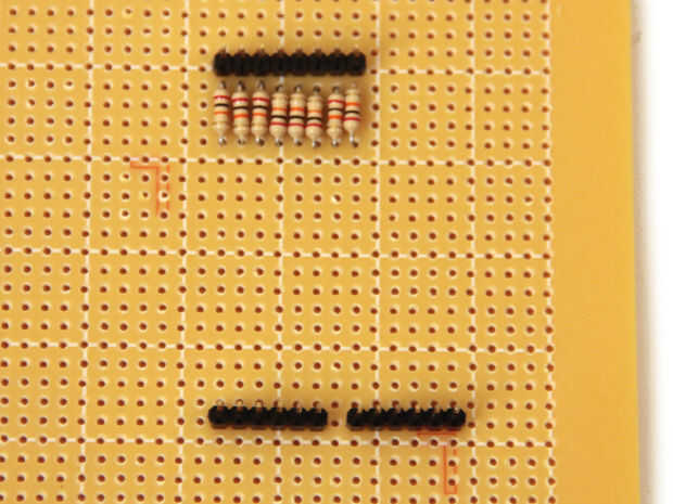 Ocho 20kOhm resistencias a los pines de arduino D0-D7 de la soldadura como se muestra en las imágenes de arriba.