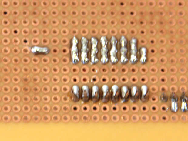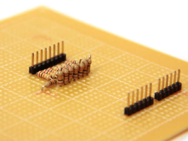 Siete resistencias de 10kOhm entre de 20kOhm usted solo soldar la soldadura.  Añadir una resistencia de 20kOhm adicional a 20kOhm conectado a arduino D0 (la parte inferior de la escalera).
