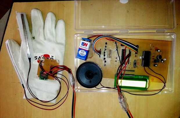 Básicamente una red neuronal Artificial es el concepto de nuestro prototipo. Algunos sensores se colocan en la mano de las personas sordas que convierte el parámetro como dedo doble mano posición ángulo en señal eléctrica y proporcionan al Atmega 328 controlador y regulador de actuar según el signo.