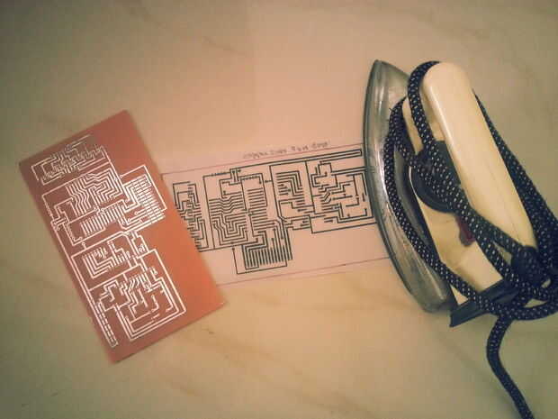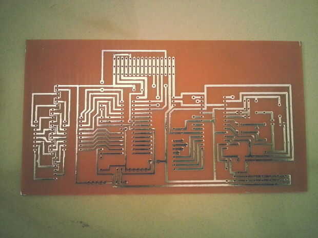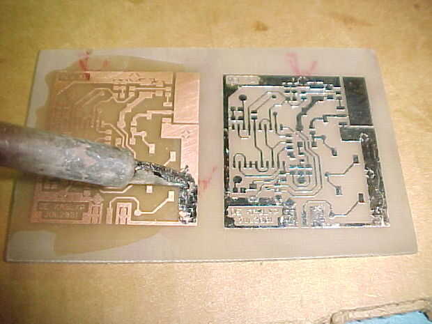 Durante el planchado el proceso que usted debe prestar la atención que toda obra de arte del circuito debe remontar completamente el tablero revestido de cobre, después de trazado de obras de arte de diseño del circuito en revestido de cobre totalmente, hacer solución de Fecl3 con agua y mantenerla trazado cobre revestido en esa solución unos 30 a 40 minutos... durante este proceso que usted debe revisar continuamente el cobre revestido en algún intervalo , cobre o de placa revestida de cobre debería desaparecer excepto parte trazado de obras de arte de diseño de circuito... medio circuito sólo debe permanecer...