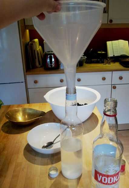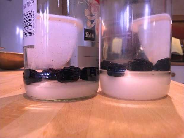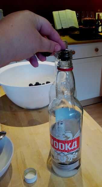 Desea añadir la mitad de las moras a cada botella, es mejor hacer este uno o dos a la vez y cubrir la parte superior de la botella como usted caer así que el vodka no salpica hacia fuera.