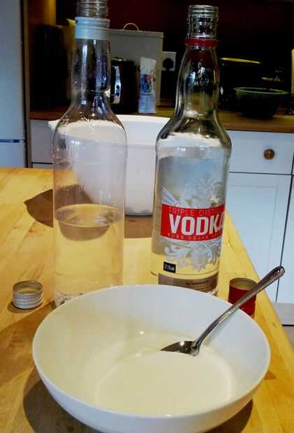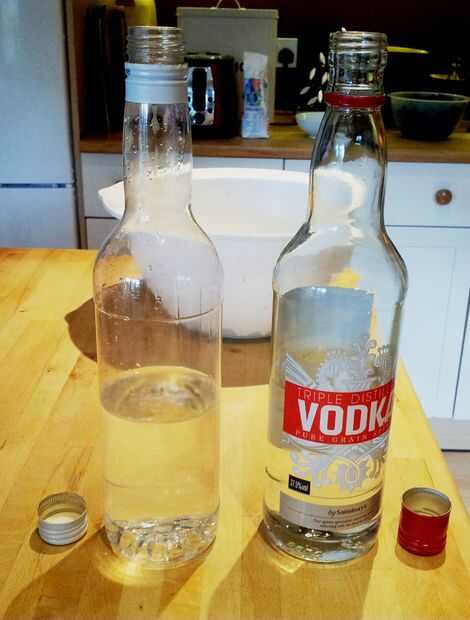 Porque la fruta toma mucho espacio en la botella, lo primero es lo primera tienes que verter la mitad de la vodka de la botella y otra botella del mismo tamaño, he utilizado una botella de aguardiente vacía que ha sido eliminada.