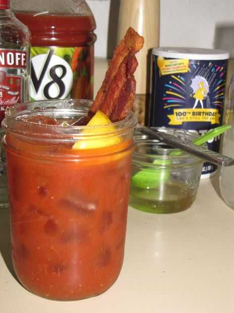 me encanta tocino (duh) y me encanta Bloody Marys, así que pude pensar en nada mejor completar mi brunch dominical que un tocino-infundido Bloody Mary. Si te sientes feisty, usted puede mezclarse para arriba su propia mezcla de Bloody Mary como sigu