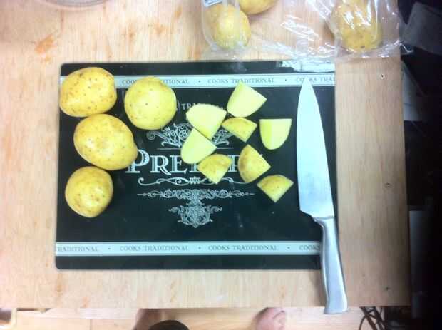 tajada para arriba como le estaría haciendo puré de patatas, picado más de mi en 8 pedazos, ponerlas en el pan de la fuente con un poco de agua.