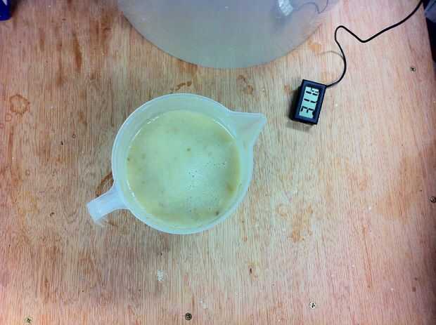 Vamos a hacer un Starter de levadura, utilizando un relleno medio jarra esterilizada con el líquido del fermentador, dejar enfriar a la temperatura de trabajo de la levadura, que debe ser entre 18-25 grados C pero busque su levadura de sus temps de trabajo. Si vas a usar levadura de panadería una temperatura de unos 22 grados C debe ser lo suficientemente buena.
