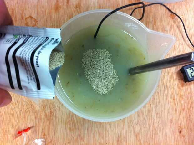Revuelva la levadura en la jarra y déjela sentarse hasta que el fermentador ha alcanzado a la temperatura de trabajo de la levadura, luego Vierta en y darle un buen revolver, probar y obtener aire allí con él si se puede esto ayudará la levadura ponerse en marcha antes de que se mete en el fermentador principal y debe acelerar las cosas un poco.
