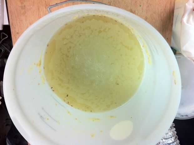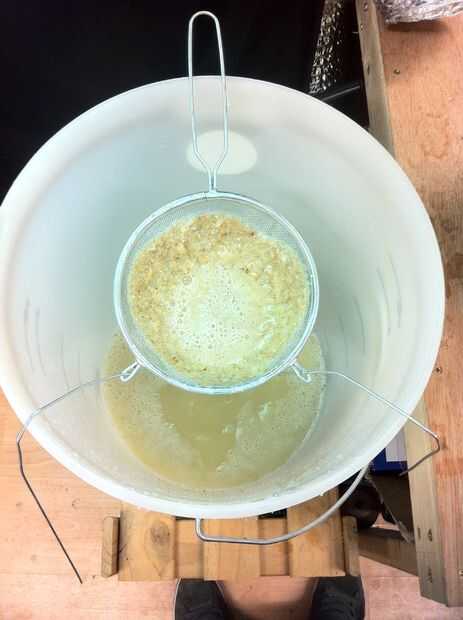 Usando un colador, vierta el líquido a través de ella para filtrar la mayor parte de los sólidos, hice este 3 - 4 veces para asegurarse de que se me quitan tanto como sea posible. Yo usa una percha de alambre para sujetar el tamiz sobre un fermentador fresco y vaciar los otros 2 en él a través del tamiz.