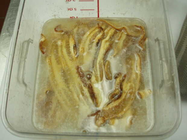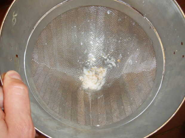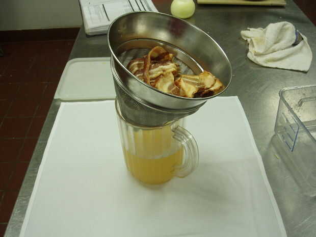 Utilicé un colador de malla para atrapar el tocino y los trozos más grandes de grasa, pero sólo podría quitar el tocino con la mano.