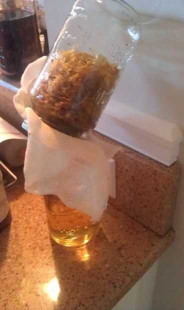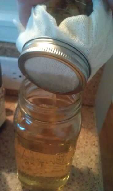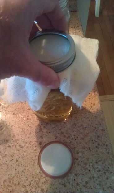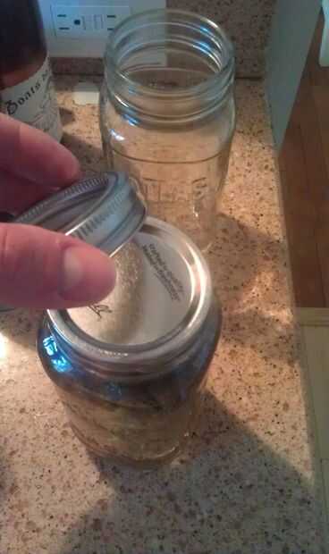 Invierta el frasco sobre otra jarra y apoyo contra la pared para mantener el frasco de drenaje en la jarra de receiveing.
