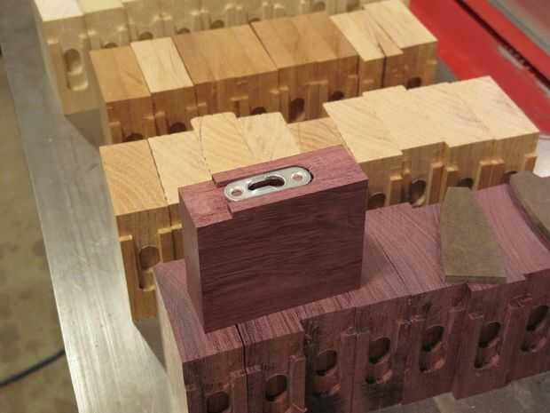 Las ranuras para los ganchos de ojo de la cerradura fueron cortadas sobre una mesa de fresadora utilizando una placa fijada a la mesa como un bloque de tope para control de longitud de corte. Se cortó la barbilla para el ángulo de aluminio "glass clip" sobre la mesa de fresadora utilizando una placa de soporte para apoyar el bloque fue empujado más allá de la broca de fresadora. Mirando hacia atrás en ella, tengo debo cortar el rebajo para el ángulo