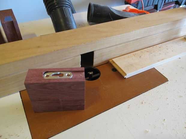 primeroy luego corte la ranura como habría reducido la cantidad de limpieza necesaria - así que usted debe considerar hacerlo en ese orden en su lugar. Después de que los cortes fueron hechos para la ranura de colgador y la barbilla para el ángulo, un corte de "sumergirse" fue realizado utilizando dos cuadras de la parada fijadas a la mesa de control de posición y longitud de corte. Usé un poco de espiral de metal afilados maquinilla de afeitar para esta operación que hizo los cortes muy suave y casi sin esfuerzo - y por lo tanto más seguro. Brocas desafiladas son muy, muy peligrosas y deben ser profesionalmente afilada o descartados.
