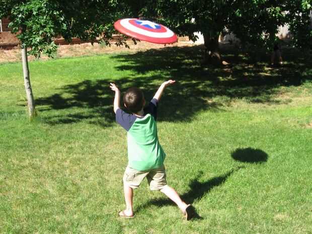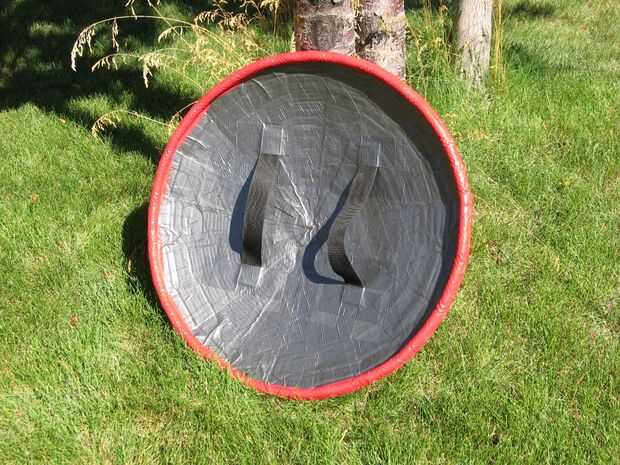 El escudo terminado es 22.5" de diámetro y pesa 27,5 onzas (780 g). Es fuerte, pero vuela muy bien. Aún así, no quiere golpear a un niño pequeño en la parte posterior de la cabeza con él, pero es sin duda mucho más segura para lanzar alrededor de esta versión (también hecha por mí).