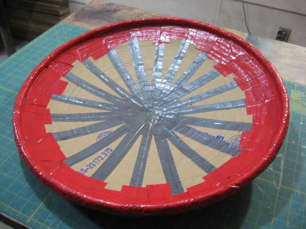 Uso 6 o 7 pulgadas tiras de conducto rojo cinta a cinta sobre la cuerda y el borde del escudo. Trate de mantener la cinta tan apretados hasta la cuerda posible así que no hay ningún grandes bolsas de aire en el interior borde del escudo.