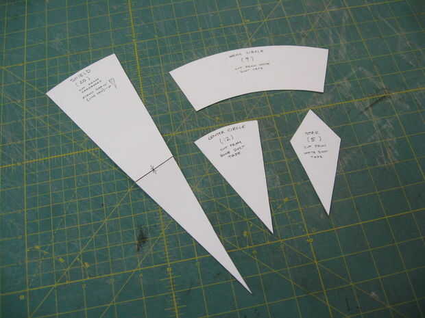 Corte con cuidado cada una de las piezas del patrón con una cuchilla afilada o tijeras. Utilizar cinta para unir las dos secciones que forman la pieza más grande en forma de cuña, como se muestra en la foto.
