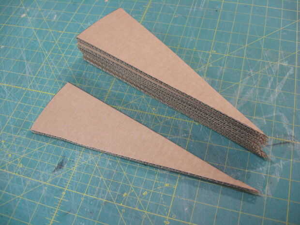 La pieza de patrón en forma de cuña grande etiquetado como «Escudo» se utiliza para crear todas las secciones individuales de cartón que van juntos para hacer el escudo.