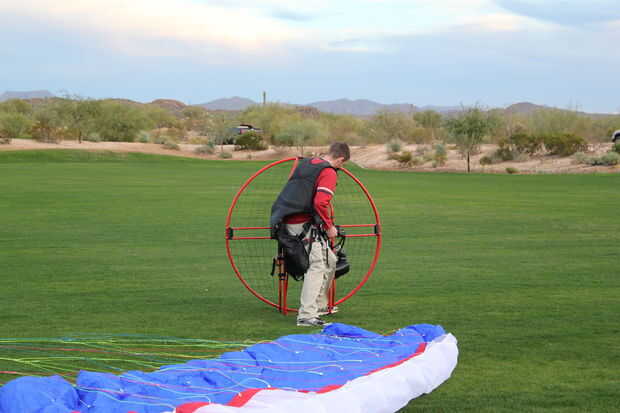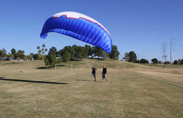 Si hay una brisa necesita averiguar la dirección y el ángulo de la misma y su cometa en el suelo por lo que va a correr en el viento. Asegúrese de que la tierra y el camino por delante está claro de las rocas, ramas, árboles, zanjas, cactus y así sucesivamente. Desea un camino claro para ejecutar así como donde tu cometa va a tocar el suelo o puede tocar el suelo. Compruebe todas las cadenas y asegúrese de que ninguno de ellos se tuercen. Con la espalda al viento, tire de las manijas y traer su cometa en el aire para encontrar la dirección exacta del viento como dirigirlo para tenerlo constante. Volver a la tierra y como el borde posterior de la cometa toca el suelo, dar un paso adelante para todas las velas son abiertos y hacia arriba que tu cometa. Las velas de la cometa son el borde muy delantero de la cometa, son los agujeros cuadrados que permiten que el aire a la cometa. Puede que necesite para alisar los bordes mismos del ala. Este proceso puede tardar un par de veces a hacer las cosas bien. La primera imagen muestra el manejo de la cometa y la segunda foto muestra la endecha de la cometa. A veces las blancas velas sería en la parte superior del borde posterior azul que está bien así.