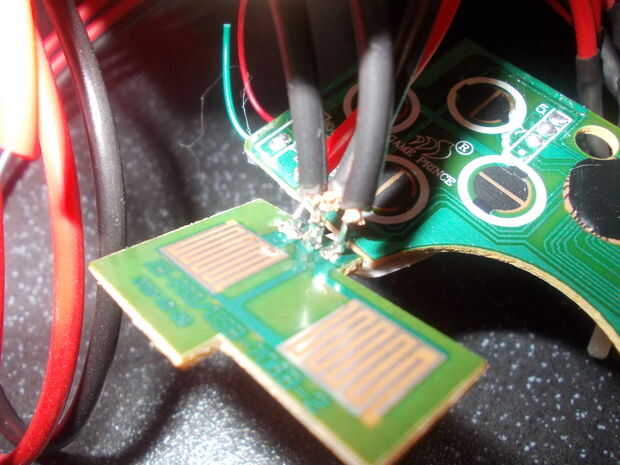 encontrar los botones traseros de su controlador (R1 R2 L1 L2) y localizar la soldadura de las juntas en la placa será necesario soldar dos cables de cada ptm cambiar a la Unión de soldadura común (normalmente el centro) de la pcb y luego soldadura entre sí de alambre a los otros 2 contactos en la placa (solo 2 interruptores ptm pueden soldarse por botones de set o posterior) puede utilizar los otros contactos de la pcb para añadir tantos botones aux como quieras solo recuerden dejar uno hacia fuera para su freno