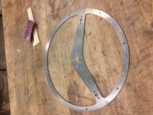Aquí hemos hecho el aluminio media parte de la rueda de manejo con un simple 2 d dibujo y corte hacia fuera en el chorro de agua.  Las dimensiones sólo críticas son los agujeros de perno y orificio de diámetro del eje donde tornillos a la columna de dirección.  Medición cuidadosa un poco va en camino.  Resultó ser que un 9 minutos cortar el archivo para el chorro de agua.