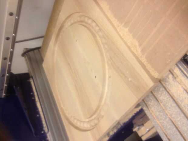 Aquí se puede ver la sección inferior que cortar.  Observe las flautas y relieves que crean la sangría de dedos que hacen la rueda fácil agarre.  Este patrón fue sacado de vintage de Danny Volvo 122 y adaptado a nuestro diámetro para el Roadster Rallier.  Aunque fácil de hacer de esta manera, tenga cuidado, el corte tomó un poco más de tres horas de tiempo de máquina total.