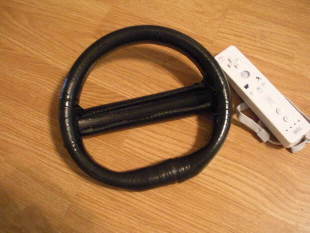 Ahora toma la mitad y cinta adhesiva en el círculo con de la parte superior de la T detrás del círculo. Que tenga que hacer algunos cortes de menor importancia del ajuste. Usted es hecho! Estaba muy contenta con la rueda porque es más ponderada que la tienda compró wii volantes y se siente más real para mí. Espero que lo disfruten también!