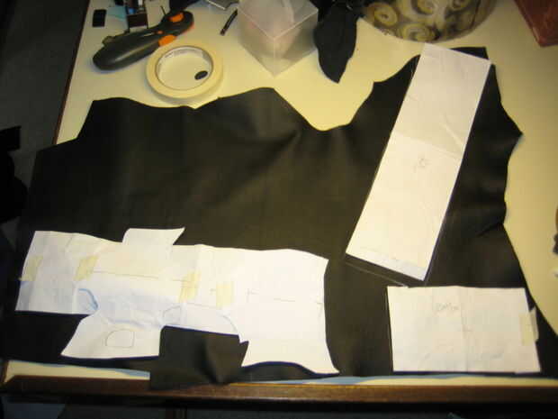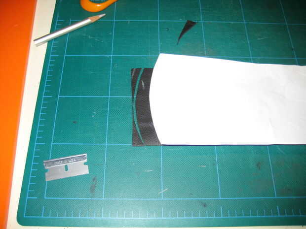 Papel fue utilizado para obtener los patrones para las formas básicas necesarias. El patrón de papel se utiliza como una guía solamente. El papel no estirar y ceder que el cuero será, por lo tanto las piezas de cuero final necesitan ser un poco más pequeña para obtener un ajuste apretado y ajustado. Por ejemplo, el ancho de la piel se redujo en 1/4" en comparación con el diámetro total de la rueda de manejo. Sólo utilicé tiza al contorno de la piel como en cualquier proyecto de la escuela.