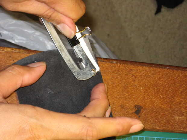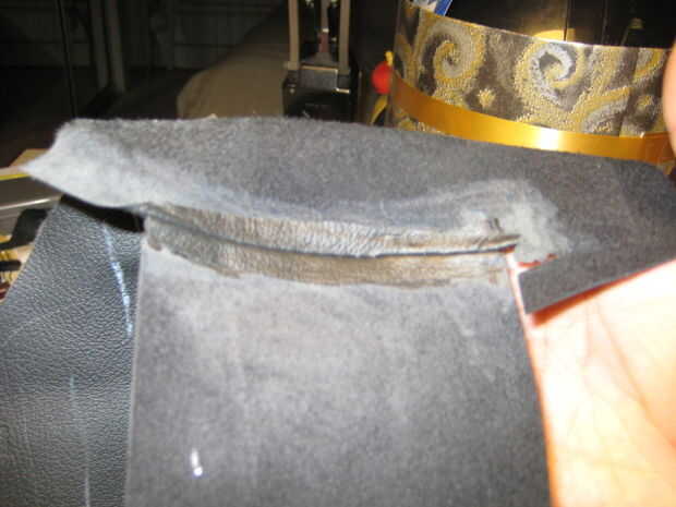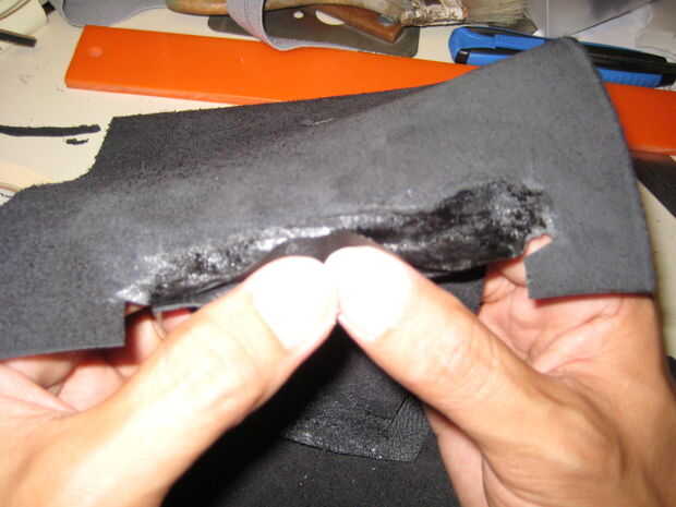 Después de rebajar los extremos de cuero en todas las costuras que se ensamblarán, el siguiente paso es permanentemente coser y pegamento que ellos juntos to end luego aplanan con un rodillo o una tarjeta plástica de crédito va a hacer.
