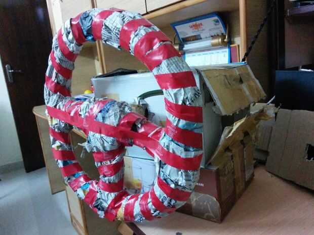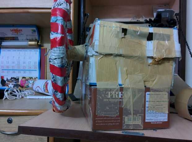 Ahora, tome una caja/caja de cartón lo suficientemente grande para colocar su dirección ensamblado en. Hacer agujeros a ambos lados de la caja para el árbol.