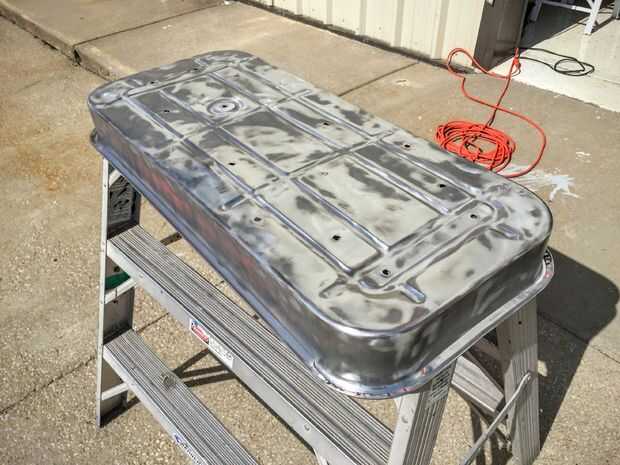Pasé una especialmente larga cantidad de tiempo en la bandeja del vagón para asegurar que todas las manchas de pintura y el óxido viejo fueron quitadas. Cuando haya terminado, tuve un pan hermoso, brillante listo para pintura. En otras partes, hice lo mejor posible para asegurar que el moho se quitó y metal saludable estaba en la superficie. Tener un vicio definitivamente habría ayudado al moler lejos en estas piezas ya que tienen puntos y como moverse un poco.