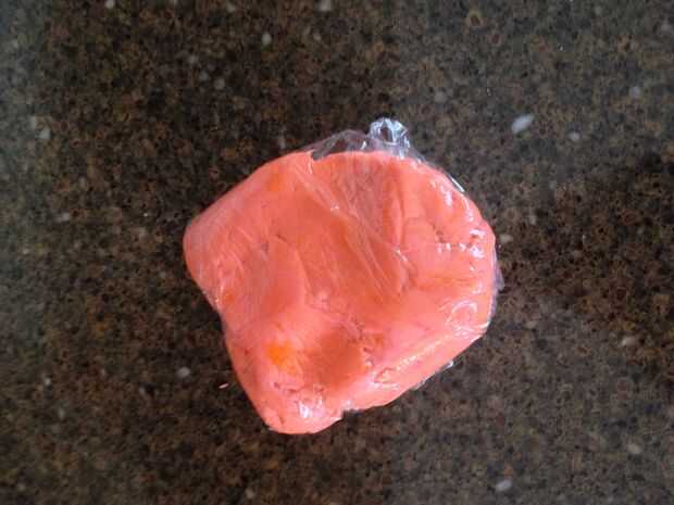 Añadir los ingredientes secos a los ingredientes húmedos hasta que forme una masa suave. Envolver 2/3 de la masa en papel plástico y chill durante al menos dos horas. Agregar el colorante rojo en el resto de la masa. Amasar ligeramente hasta que el color está incorporado. Envuelva la masa roja en envoltura de plástico y el frío.