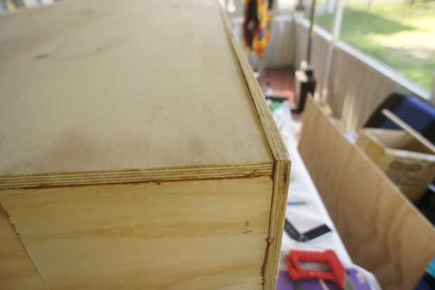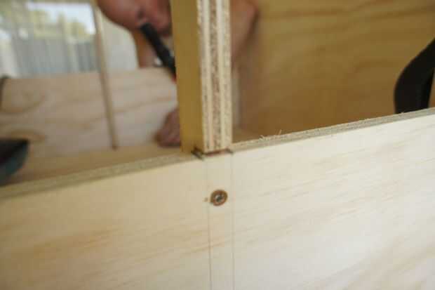 capas de 12mm es sin duda lo suficientemente gruesa como para poner un tornillo de 18G en el lado. Si eres un purista de algún tipo, quizás usted prefiera usar tornillos de bolsillo (no tengo una plantilla, y estoy seguro de que esto aumentaría significativamente el tiempo de construcción). Las juntas se pegan usando 'adhesivo de construcción' - esto tiene la ventaja de rellenar pequeños huecos causados por mano de obra inferior! En esta circunstancia, los tornillos actúan realmente como abrazaderas para unir la Junta encolada.