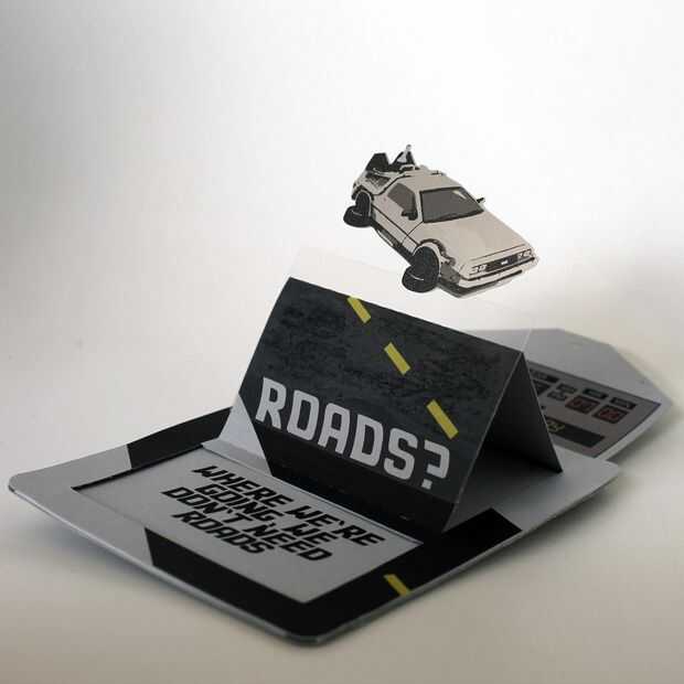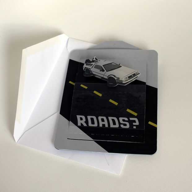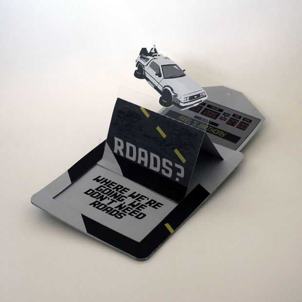 ¿Qué mejor manera que la gente emocionados por su parte que una tarjeta con una máquina del tiempo brillante que parece volar en el aire?