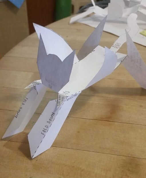 Ahora dobla las patas delanteras por la mitad a lo largo de la línea de puntos hacia el interior del cuerpo.
