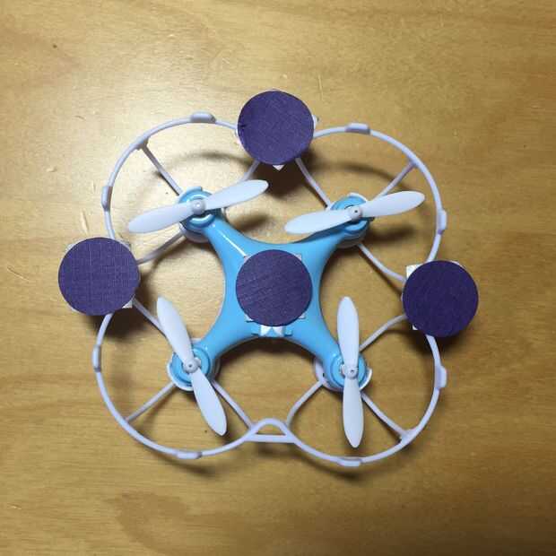 Para ayudar a la cámara reconoce el drone, colocar cuatro círculos de papel sobre el drone. Corte círculos de cartulina de colores. Usted querrá elegir un color contrastante del color de su abejón. Luego, instalar los protectores de la hélice en el drone Cheerson CX-10 y usar alguna cinta de doble cara para fijar tres círculos para la protección y al centro de los aviones no tripulados. Organizar los círculos de guardia tres hélice como se muestra en la foto, con un círculo en la parte delantera, uno a la izquierda y otro a la derecha. El lado con el interruptor de encendido no debe tener ningún círculo.
