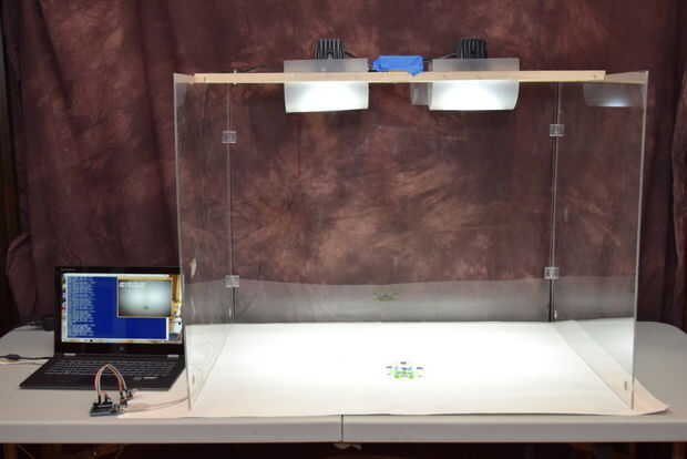 La segunda imagen muestra mi setup actualizado, construido con laterales de plexiglás y la cámara montada en las crucetas de madera. En la segunda configuración, la cámara se monta en el centro, y dos luces del LED están montadas junto a él para hacer más coherentes las condiciones de iluminación.