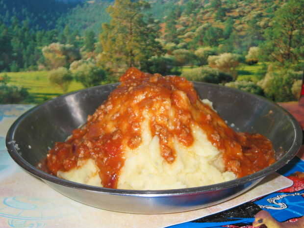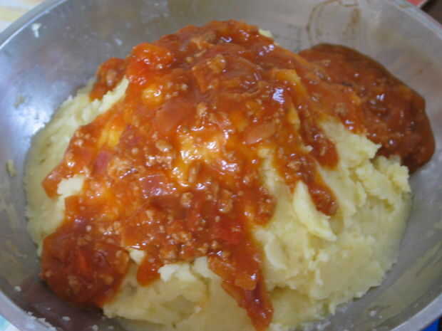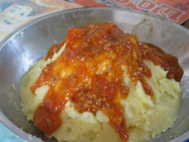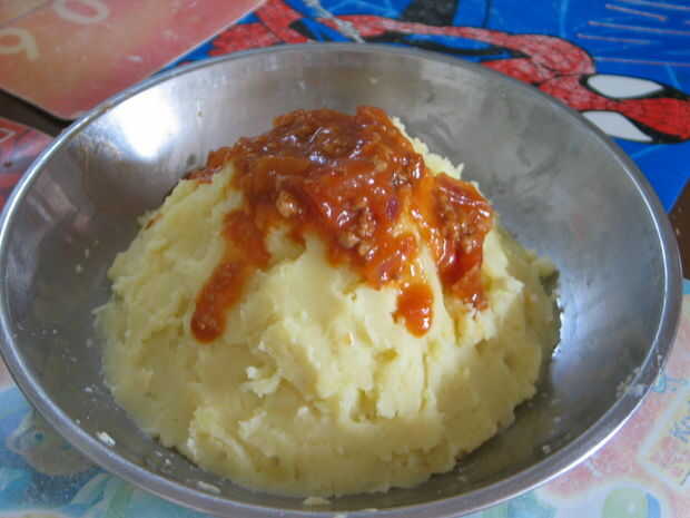 Y ahí lo tienen! El volcán de patata con salsa de tomate!