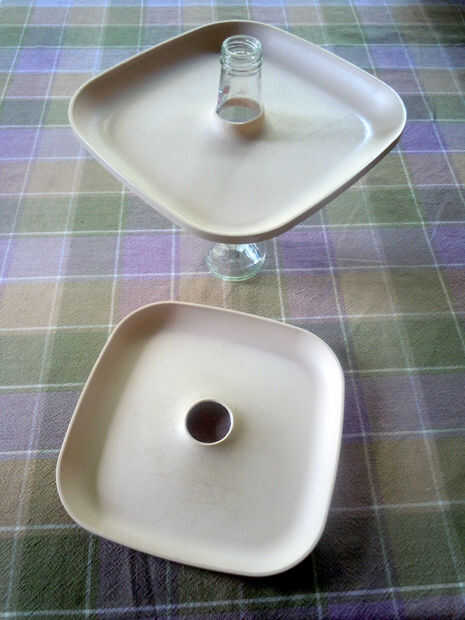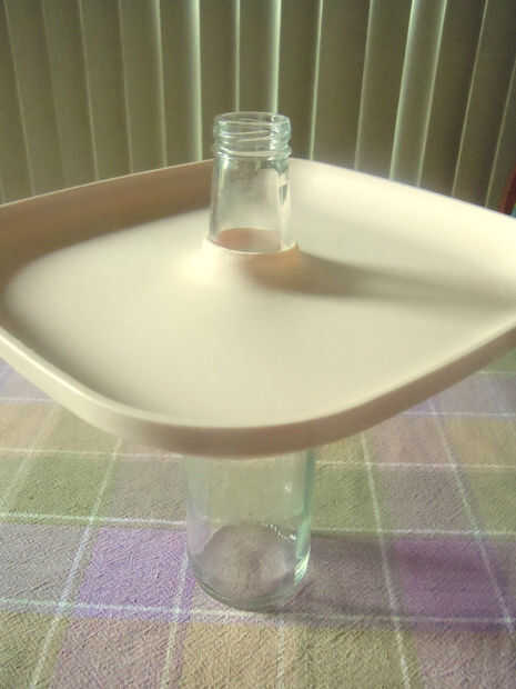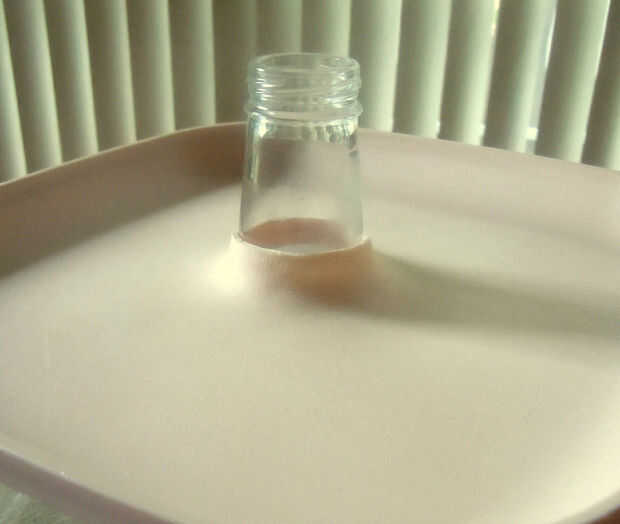 Sin dejar de calentar la placa, presione hacia abajo sobre un mandril para estirar y la forma de volcán. He utilizado una botella de cuello largo de vidrio como un mandril. Para agujeros de diverso tamaño utilicé varias botellas de condimento de vidrio de cuello largo para estirar el agujero y uno incluso utilizar un vaso cónico.