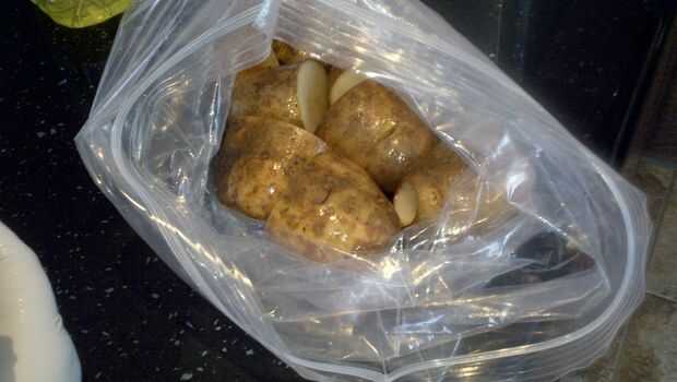 Volcar la mezcla de condimento en la bolsa con las patatas, selle la bolsa y masaje alrededor otra vez.