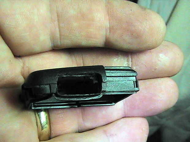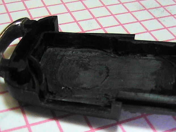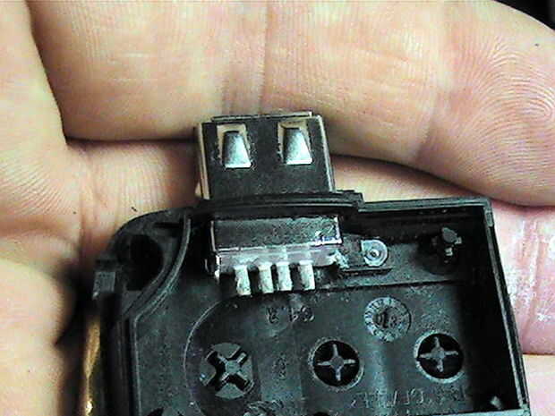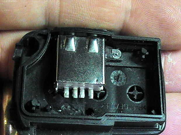 Cuidadosamente medida y retirar material donde estaba el botón de pánico. Esto es donde se instalará un conector USB hembra. Ir despacio para no hacer la abertura demasiado grande.