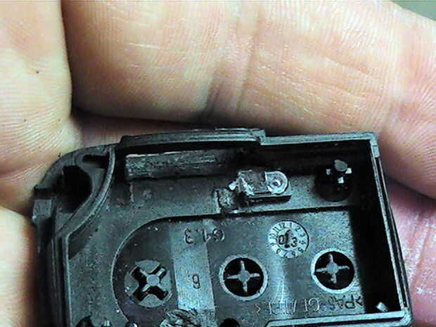 En la mitad superior de la cubierta, empuje los botones de alarma tanto como sea posible y ajuste 3 dentro de las porciones que sobresalen en la vivienda. Estas en contacto con los interruptores táctiles originalmente. Esto evitará que los botones de interferir con las tripas más adelante. Recortar estas fichas no afectará a cómo sienten los botones desde el exterior.