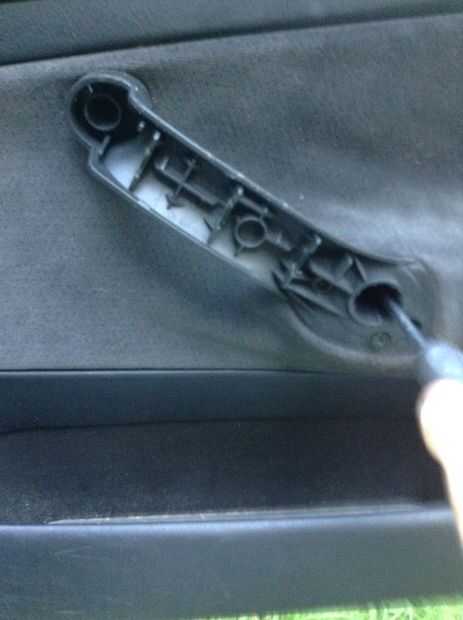 Este coche está construido con broches plásticos que mantienen juntos una mayoría de los paneles de plástico, manijas y pestillos. La parte que coge en la puerta del lado del pasajero tiene una cresta corriendo por el medio. Utilice un destornillador de cabeza plana, o navaja, protegida por un paño para no dañar el mango, para una diferencia entre las dos piezas de la manija de la cuña. La cara en el coche lo ahora pop (cuadro 1) y unos tornillos de cabeza Philips. Un destornillador magnético es muy útil para esto, como los tornillos se fijan en la puerta, especialmente durante el montaje. Una vez que salen los tornillos Retire la manija interna y debe buscar como imagen dos.