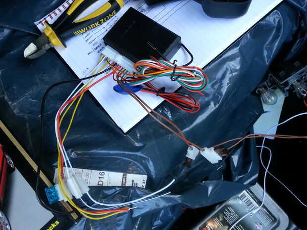 Encontré que los cables amarillos de la alimentación a la caja de control eran más cortos que el resto, así que cortar el cable rojo hacia la misma longitud (que era un poco después de su protección de fusibles). Luego había despojado posterior 1/2" del aislamiento y trenzados entre sí el núcleo de todos los 3 cables. También corté los cables 2 blanco bloqueo/desbloqueo y negativo a la misma longitud, pelando 1/2" del extremo de cada cable y girando para poner en orden.