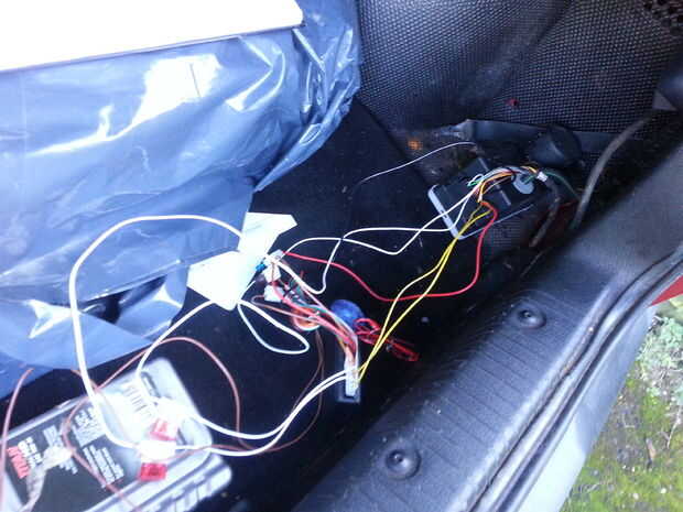 Primer paso en mi mock up era decidir dónde montar la caja de control de receptor pequeño que puse justo detrás de la materia de la espuma que recubre el borde de la bota, justo al lado de la luz. De esta manera esto significó que podía determinar cuánto acortar que cables del telar que viene con la caja de control remota. Separé los cables que fueron 'Sin conexión' en mi esquema y les incluye el amarre del cable que une los cables en el paquete, así que tienen longitudes de cable debo quiero añadir en el futuro.