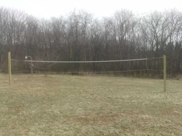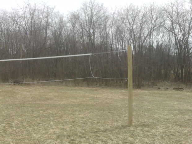 Como dijo antes de que buscado en la web para dimensiones de canchas de voleibol y después de la reducción de las dimensiones de algunos para ayudar a montar en el patio y porque es recreativo empezamos a planificar. Condujo el rebar de acero en el suelo para marcar la ubicación del primer poste y luego usa un pedazo de cuerda de nylon, cinta y un nivel de medición para encontrar donde iría el segundo Polo. Después de esto utilizamos algunas matemáticas para determinar la profundidad que íbamos a hacer los agujeros para que las tapas de los postes eran de nivel uno con el otro. El hoyo cuesta arriba tuvo que ser mucho más profunda que el descenso para nivel. Después de utiliza una cuerda atada a cada poste y había nivelada con un nivel de espíritu/burbuja normal. Luego fuimos al punto medio de los dos polos y determina cómo es alto la cadena fue de la tierra. Luego, utilizando matemáticas determinamos cuánto más alta la red debe ser mantener nivel aunque los polos y la tierra no eran (significado: la altura media de la red es estándar, colina es un poco más corto, cuesta abajo un poco más alto). Luego perforar el agujero para la red y utilizar una hebilla de vuelta a un tornillo que llega por correo todo para ajustar la red.