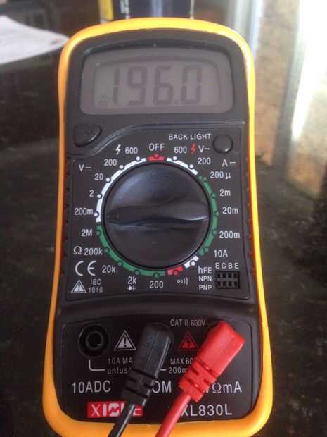 Si está usando un multímetro, gire la perilla a V - 200m y poner el cable negro en la hoja y el rojo en la cima de la pila y esperar resultados. Tengo 196.0. Si los números van haywire parar entonces en 1., entonces que es normal.