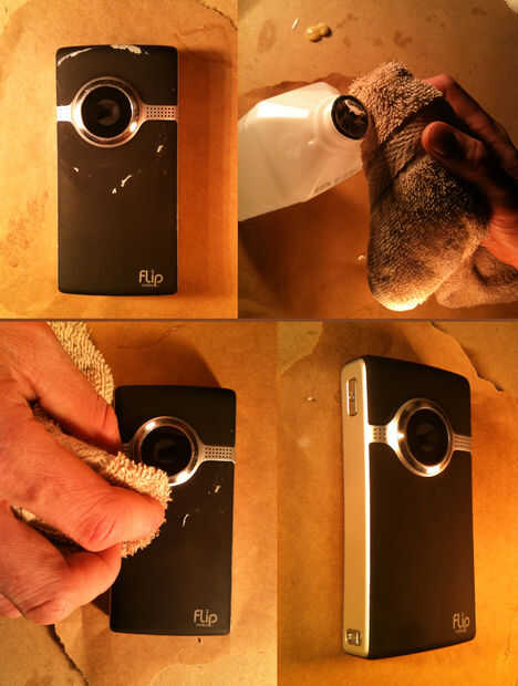 Puede haber residuo de cinta del conducto por lo que necesitarás bolas de algodón o una toalla de algodón regulares e isopropílico alcohol isopropílico para limpiar el HD Flip. Aplique el alcohol en una esquina de la toalla y frotar el residuo de la cara de la cámara. Usando una parte limpia de la toalla puede limpiar el resto de la cara para asegurar un palo fuerte para otra aplicación de cinta.