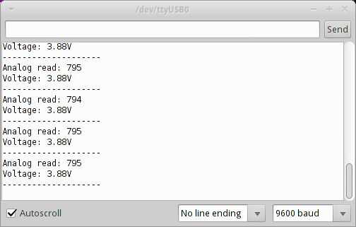Jugo actual de su LiPo es dos veces la lectura haz de Arduino (Recuerde, nos reduce a la mitad el voltaje antes de medir)