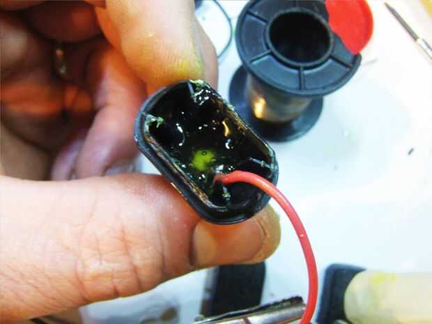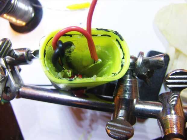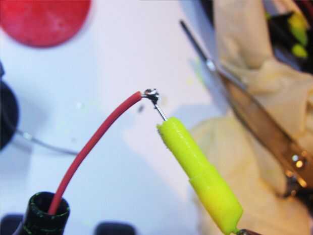 Inserte el pasador a través de la punta. Colocar el cable rojo a través del agujero en la cabeza del marcador y soldadura a la punta.
