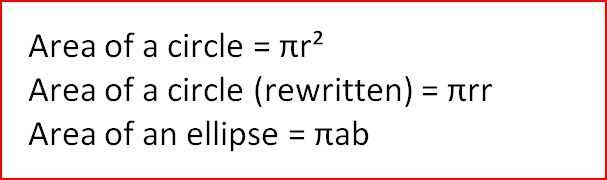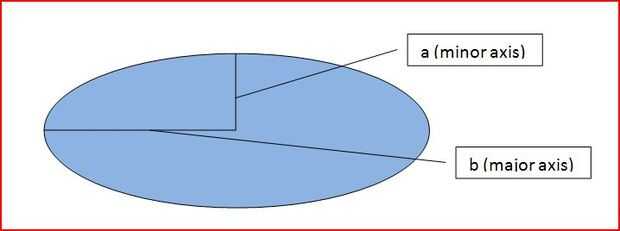 Mira la fórmula para calcular el área de un círculo abajo. Ya que sabemos que cuadrar un número significa multiplicar por si mismo, podríamos reescribir la fórmula como pi x r x r. Resulta que, calculando que el área de un círculo es un caso especial de calcular el área de un círculo aplastado, conocido técnicamente como una elipse. Una elipse tiene dos medidas, uno orientado verticalmente a través del centro de la elipse se denomina eje menor (para calcular el área necesitamos 1/2 de la longitud del eje menor, que llamaremos a) y uno a través del centro en el eje largo de la elipse llamado eje mayor (digamos la mitad de la longitud del eje mayor b). Para calcular el área de una elipse, la fórmula es pi x a x b. Multiplique el área de la elipse por la altura y tienes el volumen de un tubo con una sección transversal elíptica.